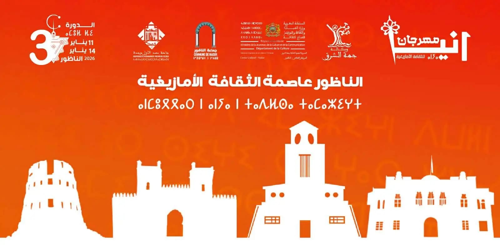 تشهد مدينة الناظور احتضان الدورة الثالثة من مهرجان «أنيا» للثقافة الأمازيغية، خلال الفترة الممتدة من 11 إلى 14 يناير 2026، في تظاهرة ثقافية وفنية كبرى ترفع شعار «الناظور عاصمة الثقافة الأمازيغية»، وذلك احتفاءً بذكرى تقديم وثيقة المطالبة بالاستقلال، وبحلول رأس السنة الأمازيغية الجديدة.