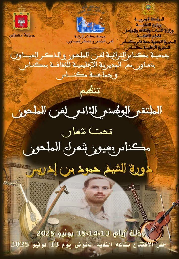 تنظم جمعية مكناس التراثية لفن الملحون والذكر العيساوي، في إطار انشطتها الثقافية والفنية الرامية إلى صون التراث اللامادي، بتعاون مع المديرية الإقليمية للثقافة بمكناس، وجماعة مكناس، الملتقى الوطني الثاني لفن الملحون تحت شعار : “مكناس بعيون شعراء الملحون ” وذلك خلال الفترة الممتدة من 13 الى 15 يونيو الجاري.